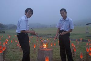 8月11日(水曜日)、グリーンパーク都路において、「東京2020パラリンピック聖火フェスティバル田村市の種火起こし」を行いました。田村市の代表的な夏祭りの一つである「都路灯まつり」の竹灯を再現し、田村市の採火者である都路中学校の村上瑠祈さん(1年)と𠮷田圭吾さん(3年)に、竹灯から火を採火いただき、田村市の種火を作り上げました。